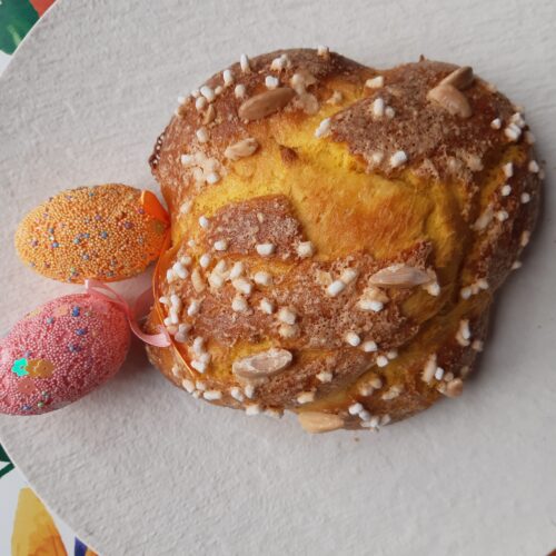 - Scaldare il forno a 170° e nel frattempo preparare la glassa unendo in una ciotola circa 20 g di albume, lo zucchero a velo e la farina di mandorle. Una volta terminata la seconda lievitazione spennellare la colomba con la glassa, aggiungere le mandorle, la granella di zucchero e infornare.