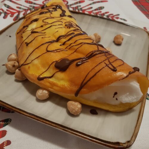 - Una volta cotta ripiegare la crespella su se stessa e guarnire con burro di arachidi e nocciole.
