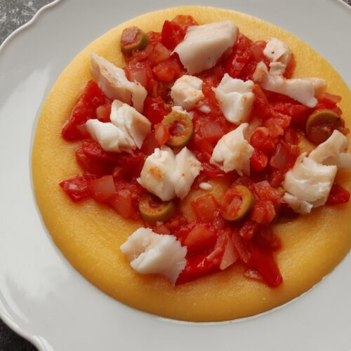 - Mettere a cuocere la polenta seguendo le indicazioni riportate sulla confezione e una volta cotta condire con il sugo e il baccalà. Completare con olio a crudo.