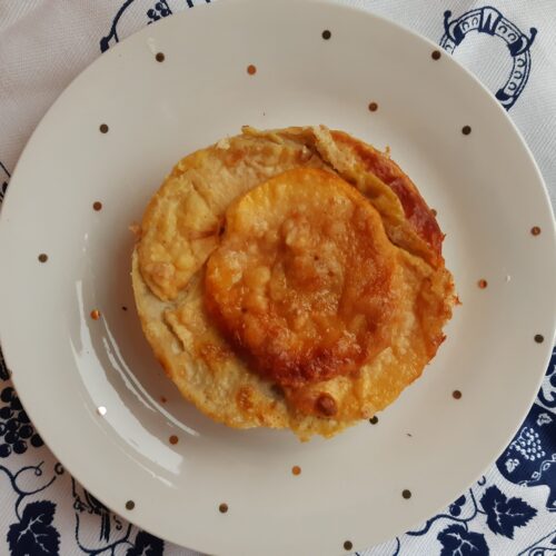 - Versare nelle tortiere le fette di mela e sopra l'impasto ottenuto suddividendolo tra le due. Mettere metà del burro su ogni tortina e lo zucchero di canna per formare una leggera caramellatura finale.